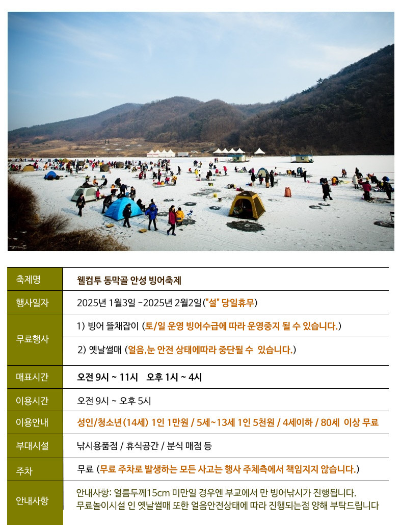축제 일정과 장소는 다음과 같습니다. 2025년 1월 3일부터 2월 2일까지 한 달 이상 진행되며, 주로 광혜원 저수지와 동막마을 일원에서 열립니다. 이곳은 얼음이 두껍게 얼어붙어 안전하게 낚시를 즐길 수 있는 조건을 갖추고 있습니다